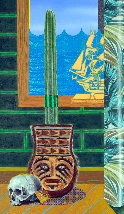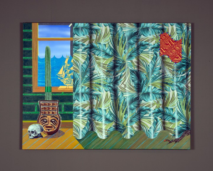 2024. Pintura “granito” (al agua) y acrílico con espesante, arena y glitter sobre lona estampada e imprimada, 120 x 160 cms. [Fotos: Sebastián Mejía]