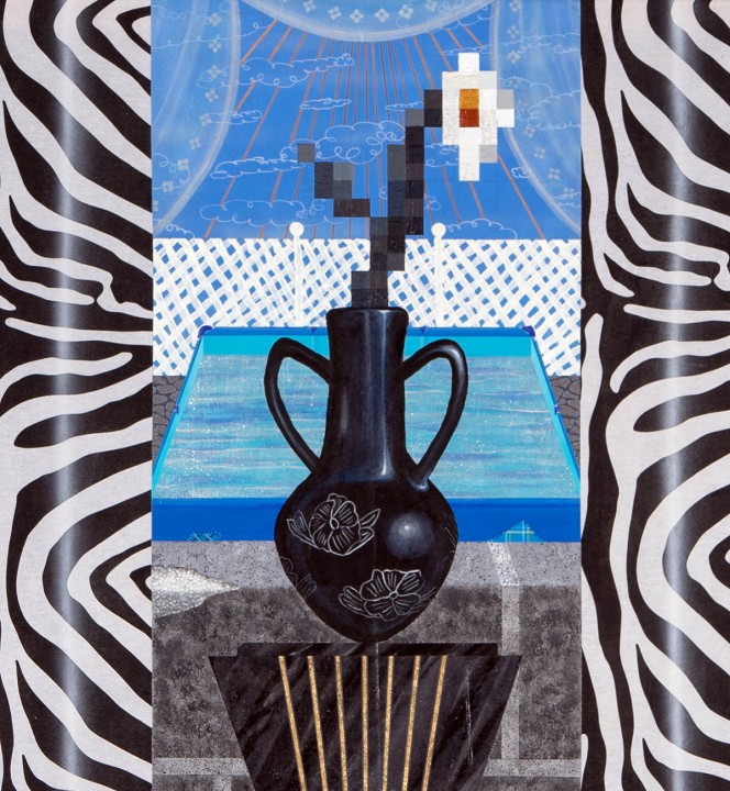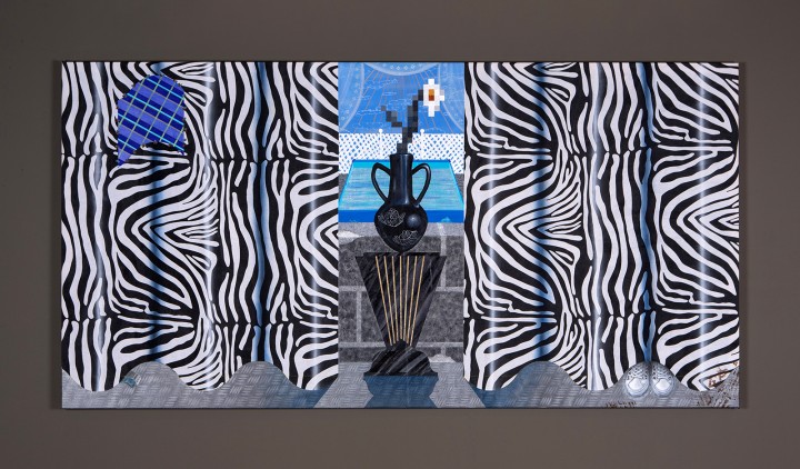 2024. Lámina metálica y pintura acrílica con espesante, arena y glitter sobre lona estampada e imprimada, 131 x 258 cms. [Fotos: Sebastián Mejía]