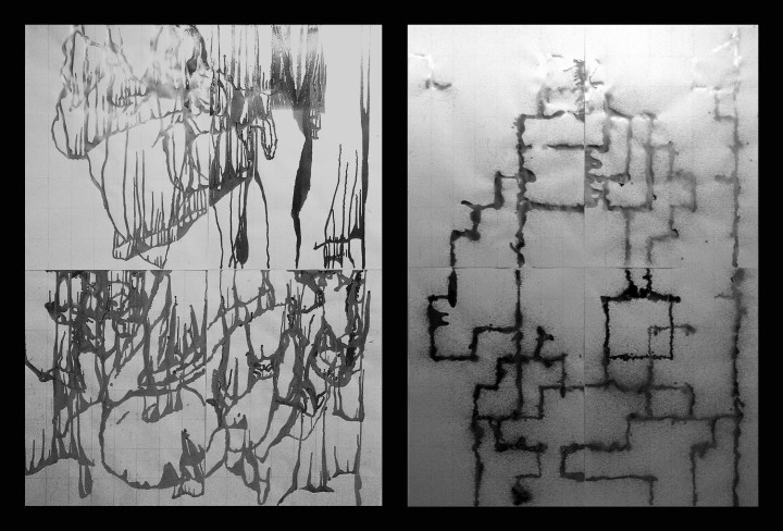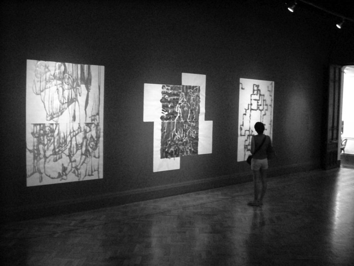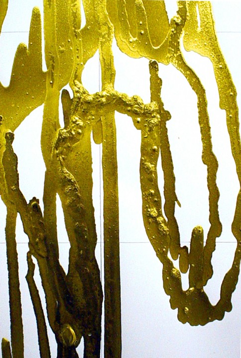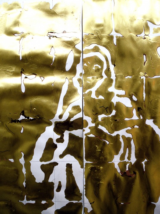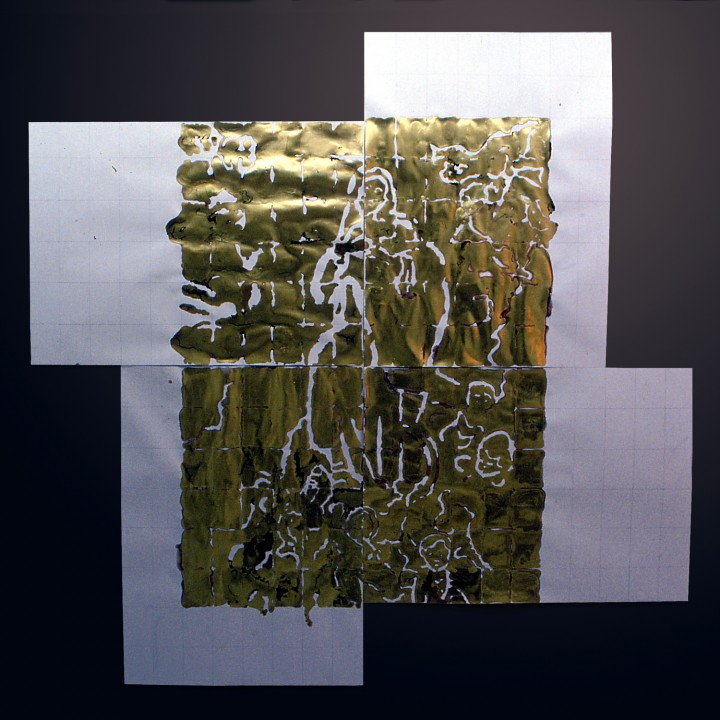 2003. Purpurina dorada y grafito sobre papel, 210 x 142 cms, 210 x 210 cms, 210 x 142 cms. Exposición "Subversiones / Imposturas", MNBA, Stgo., Chile.