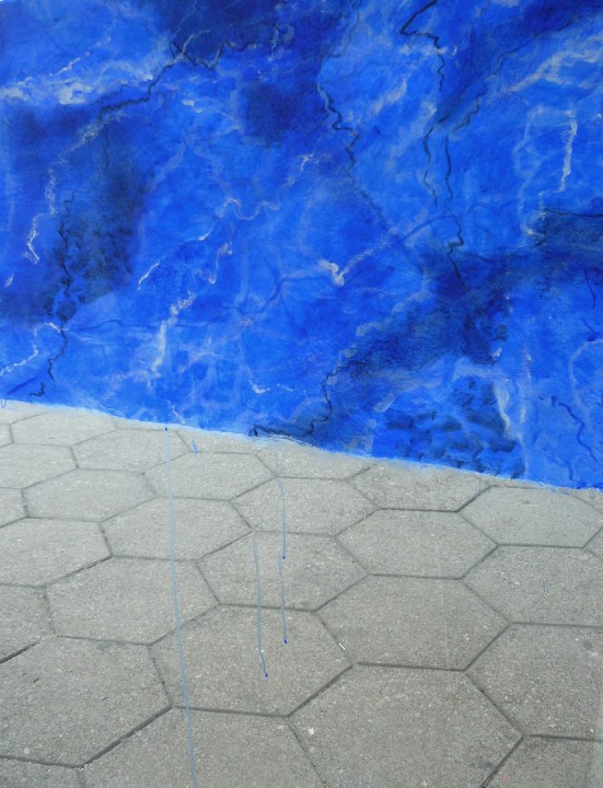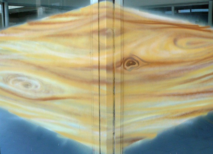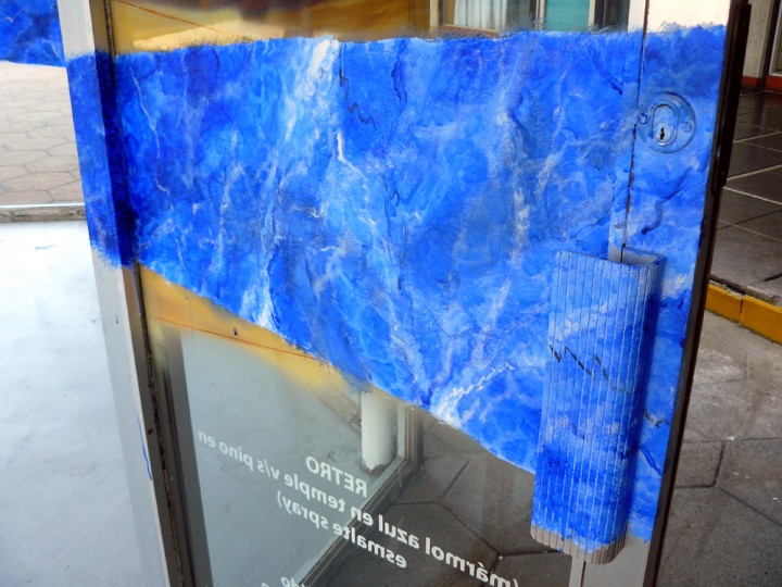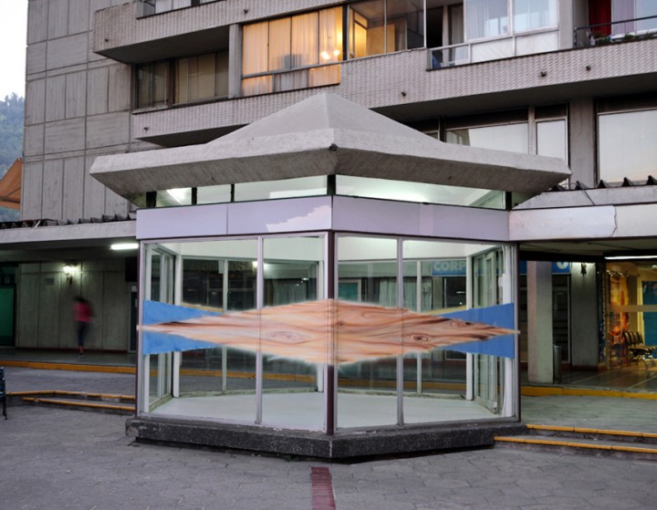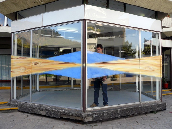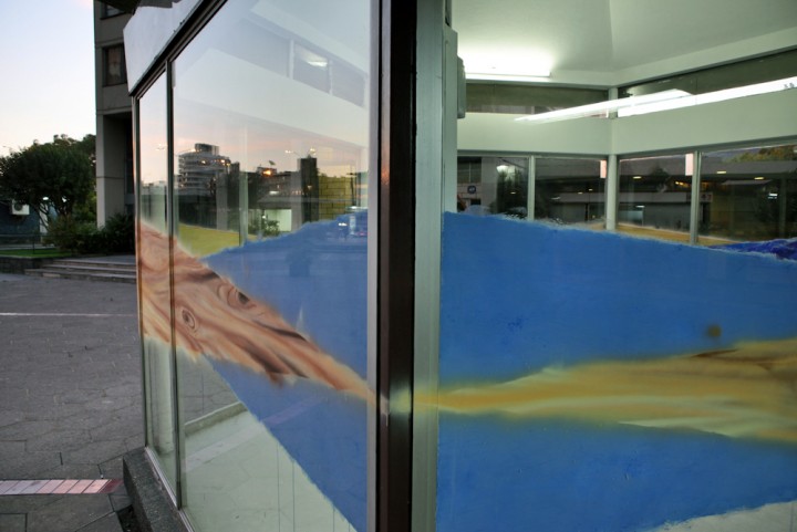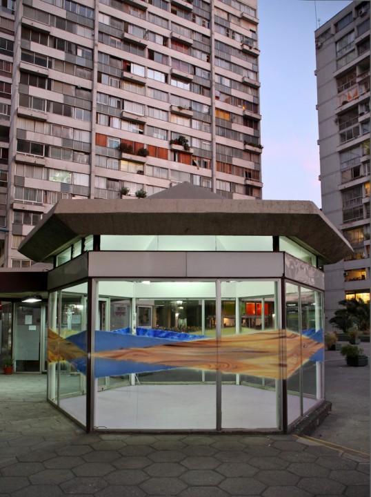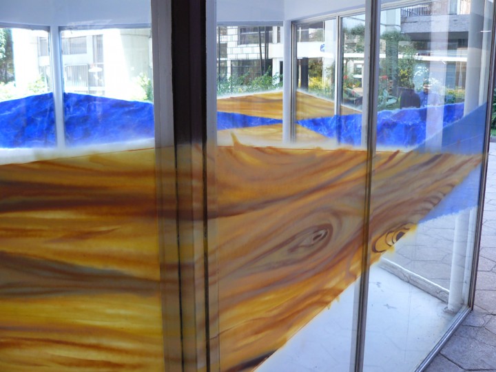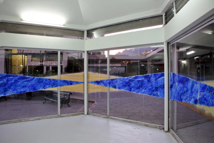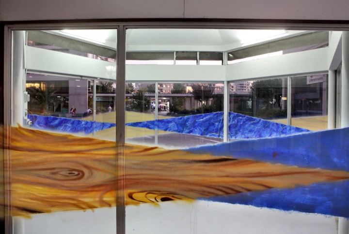 2012. Pintura al temple (interior) y esmalte aerosol (exterior) sobre vidrio y perfiles de aluminio. Galería Tajamar, Stgo., Chile.