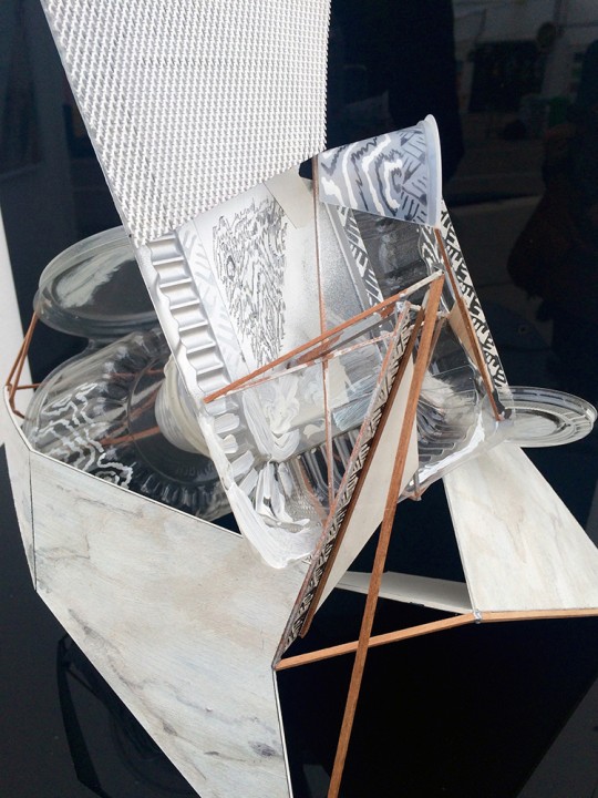 Pintura acrílica, palos de maqueta, cartón, envases plásticos y otros materiales; base variable: repisa acrílica o estructura de cartón (panal o corrugado doble) pintada a mano; medidas variables.
