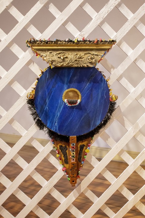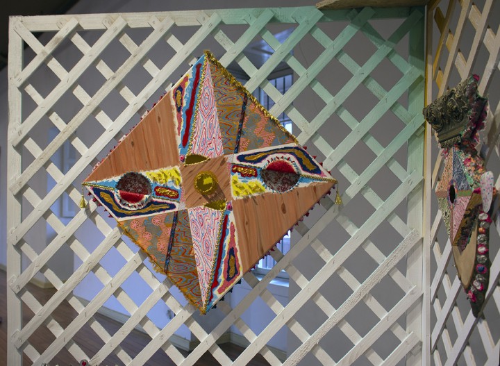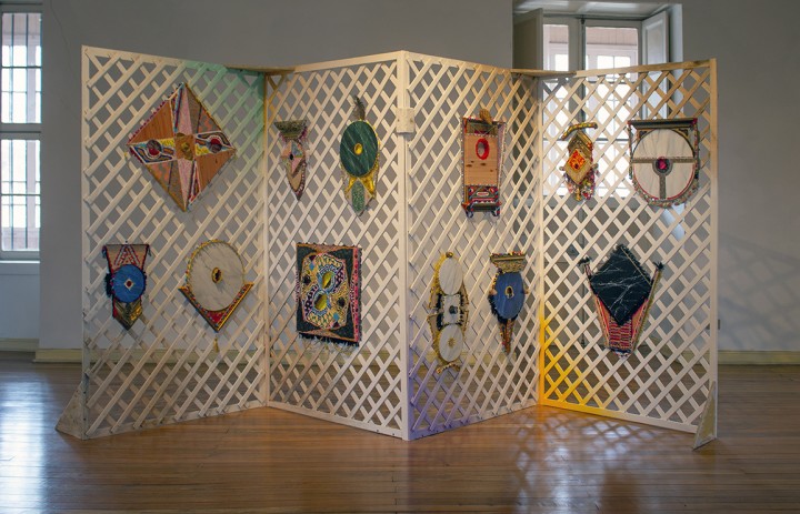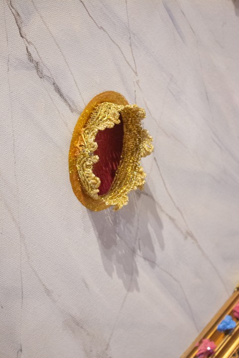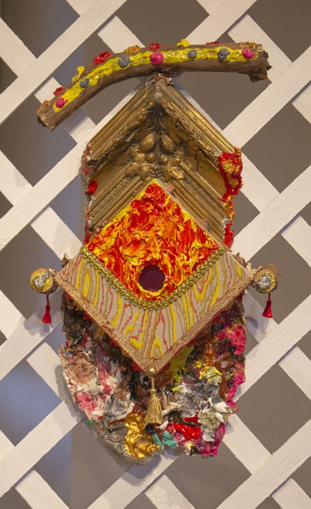 Pintura acrílica y al óleo, espesante, tela, flecos, escarcha metálica, entre otros materiales; medidas variables.