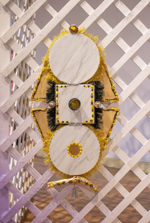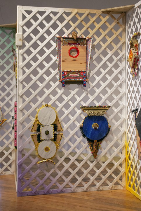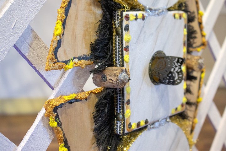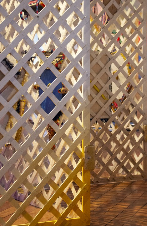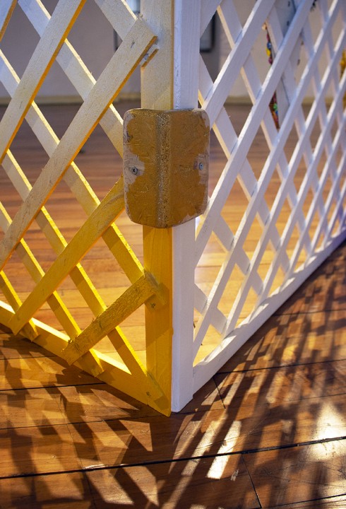 Cuatro paneles de "treillage" pintados con aerosol, pintura dorada y escarcha; piezas de madera OSB, tornillos (total estructura: 200 x 109 x 357 cms).