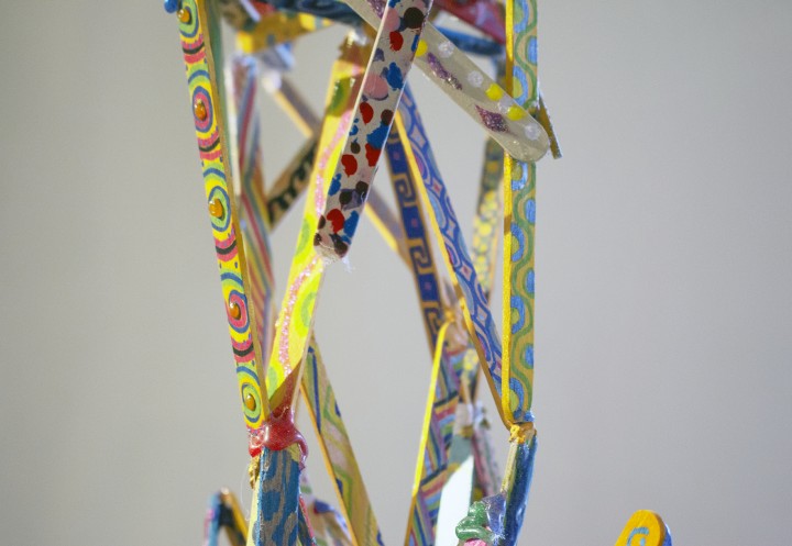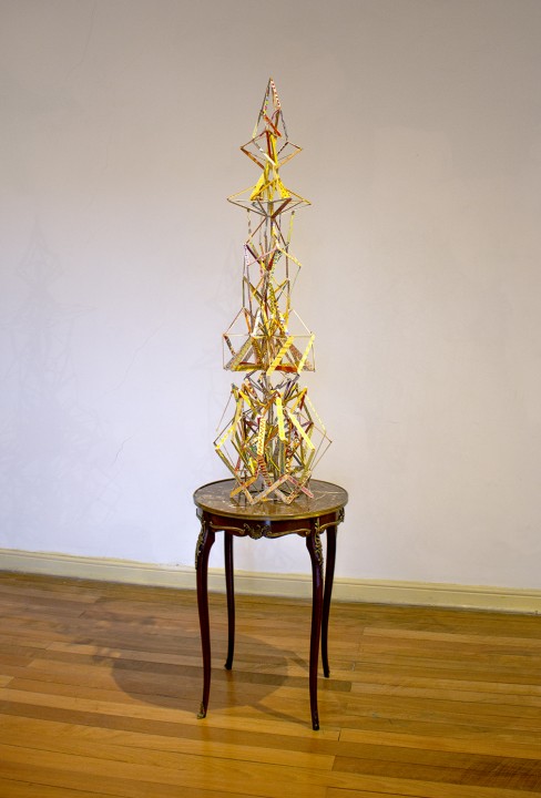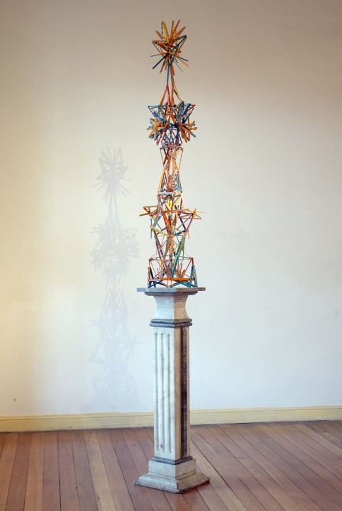 Palos de helado, pintura acrílica, espesante, escarcha, barniz de uñas y silicona escarchada (papel metálico bajo Construcción 2). Medidas variables. Objetos de la colección del Museo de Artes Decorativas y del Museo Histórico Dominico (Stgo., Chile): mesa de apoyo de caoba con cubierta de mármol de Carrara (del XIX o anterior), pedestal eclesial de mármol gris (sin datación) y mesa auxiliar francesa del siglo XIX con cubierta de mármol café. Colaboración de Emilia y Victoria Pulido.