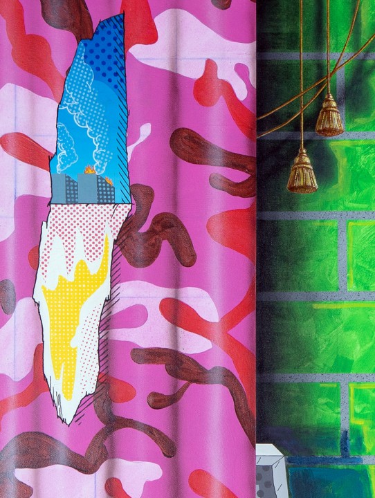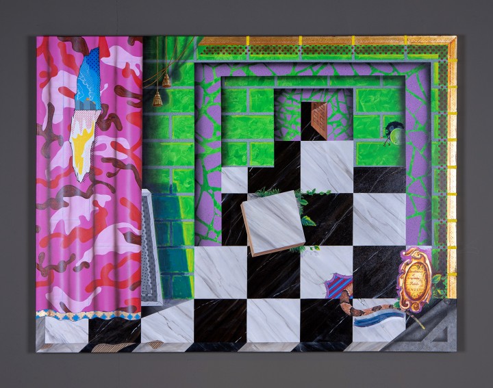 2022. Pintura “granito” (al agua), lámina metálica y pintura acrílica sobre lienzo (algodón), 120 x 160 cms. [Fotos: Sebastián Mejía]